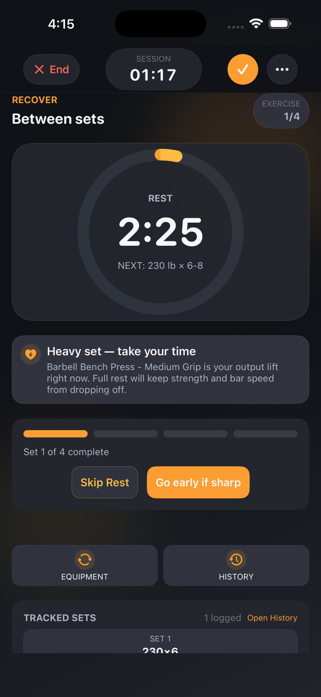 Say "225 for 8" and the set is done. Hands-free between rounds.