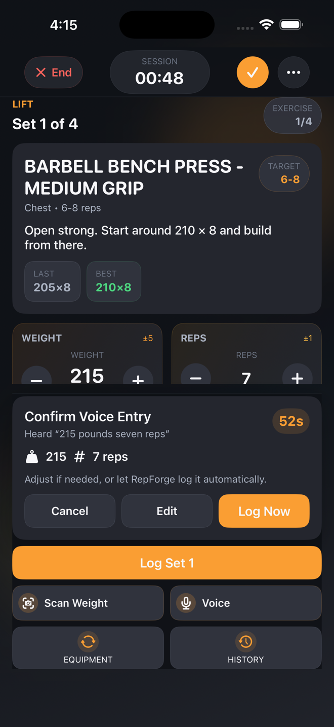 Speak the weight and reps between sets. RepForge parses it on-device and logs the set before you sit back down. No typing. No phone-fumbling between rounds.