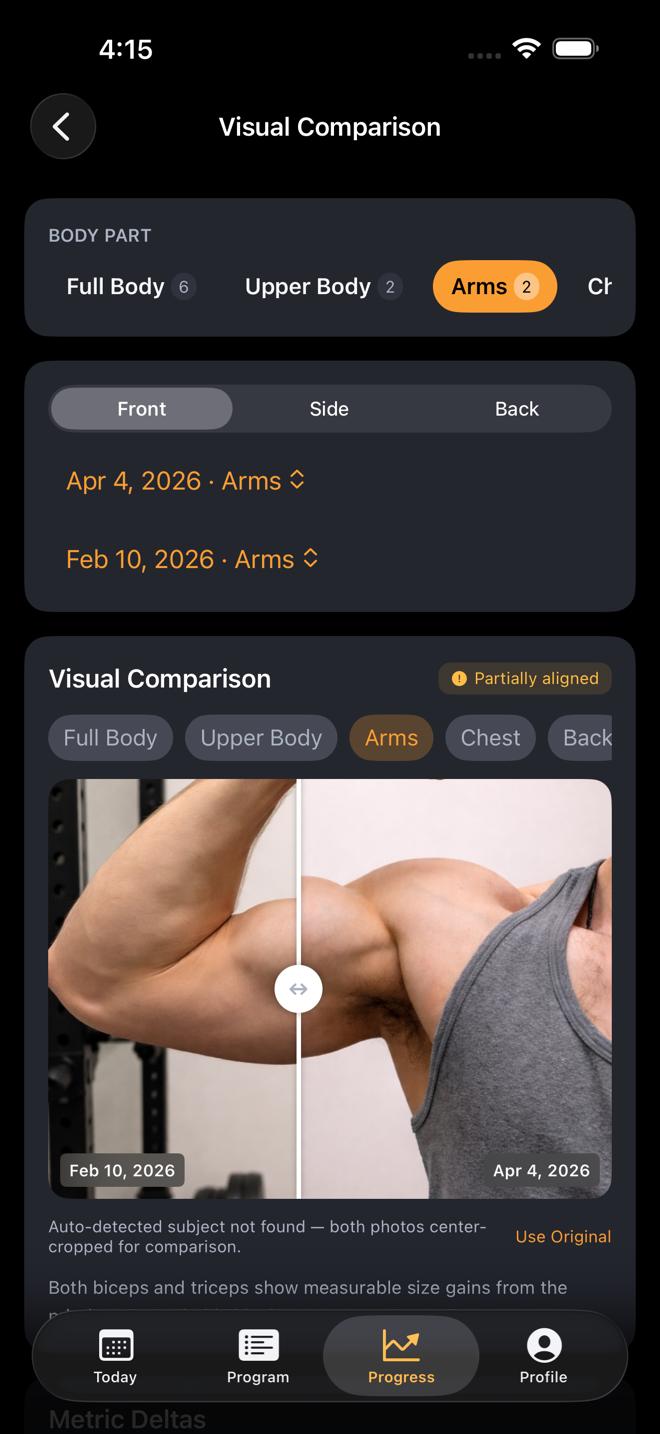 Capture full-body or focused-area photos with on-device pose analysis. Visual comparison slider auto-aligns shots taken weeks apart so you can actually see the change.